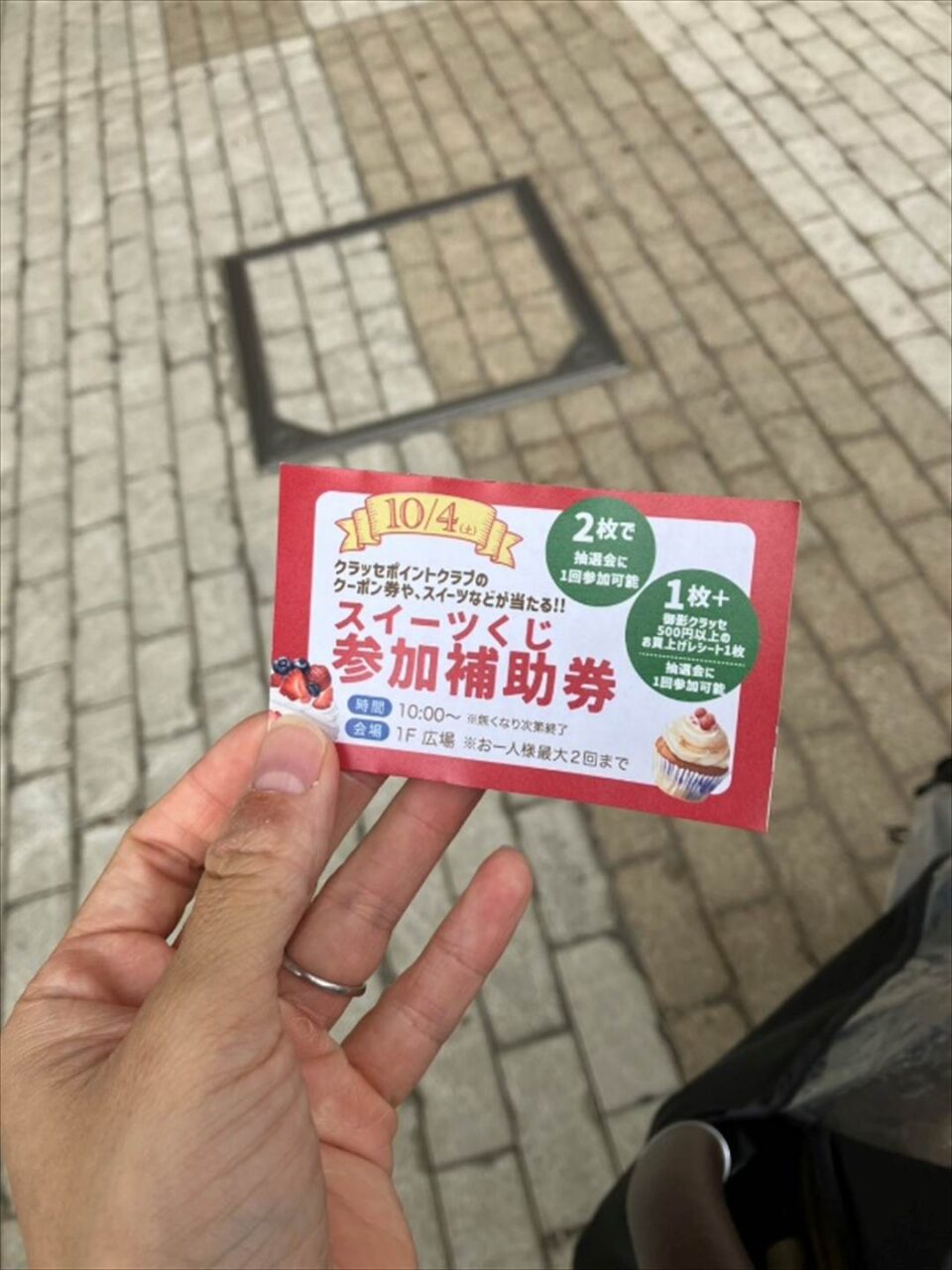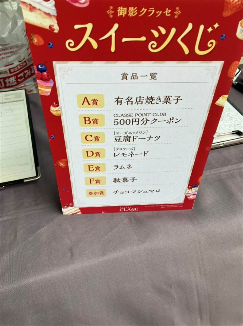 また、このフェスでは当日各店舗500円以上のスイーツ購入でスイーツくじの参加補助券をもらうことができ、補助券2枚もしくは補助券1枚とクラッセで500円以上の買い物レシート1枚で1回くじに参加できました。