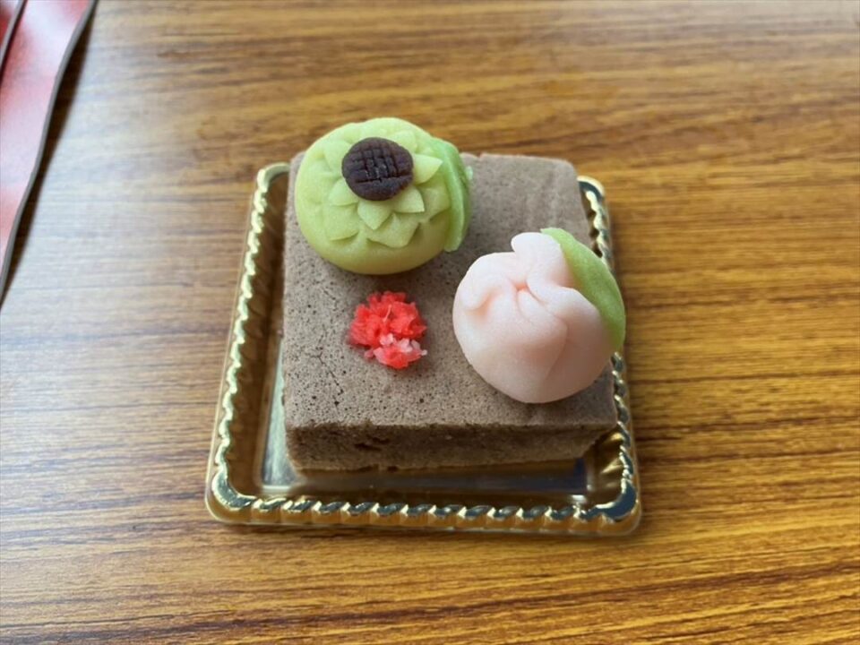 和菓子で作られたヒマワリとチューリップが咲いている可愛らしくて世界観がギュッと詰まった和菓子です。
