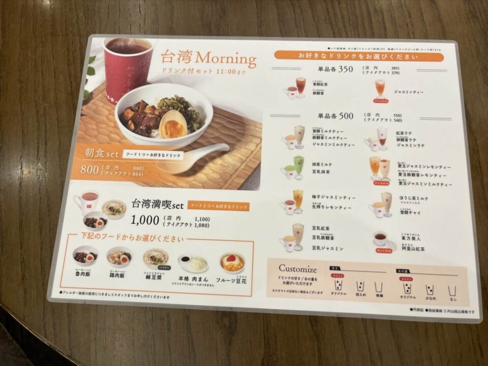 台湾モーニングでなければ、魯肉飯は550円、鹹豆漿は550円、愛玉ジャスミンレモンティーは700円でした。トータル1,800円(税抜)。これが台湾モーニングだと1,000円!かなりお得ですよね?