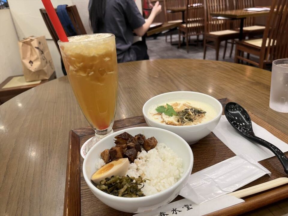 今回私が選んだのは魯肉飯、鹹豆漿と愛玉ジャスミンレモンティー(アイス)です。鹹豆漿って何?愛玉ジャスミンレモンティーの愛玉って何?って思って。是非ともこれは食べてみないと!