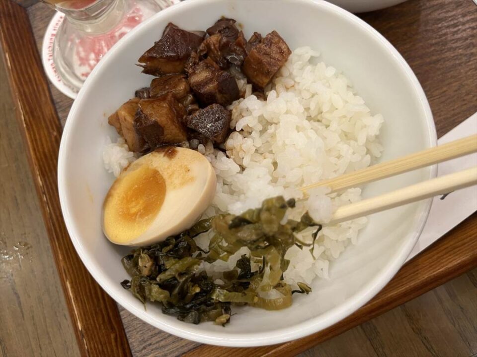 まずは魯肉飯から。小さく切ったお肉がゴロゴロっと入っていました。甘辛い味がしっかりついてご飯が進みます。魯肉飯といえば、あちこちで食べる機会があり、中には八角や五香粉などスパイスがよく効いたものもありますが、春水堂の魯肉飯は割と日本人好みの癖のないさっぱり味。スパイスが苦手な人も普通に食べられる万人受けする味付けでした。
