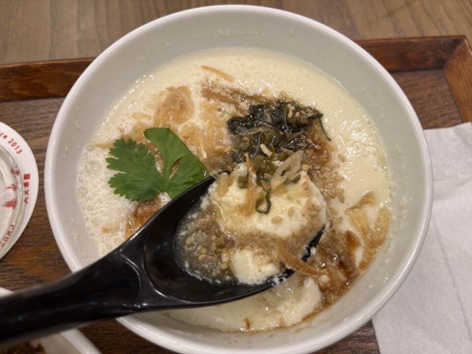 次はこちら。鹹豆漿(シェントウジャン)です。これは辛いのか、甘いのか、フードなのかスイーツなのかと思っていたのですが、一口飲んで驚きました。温かくて豆腐スープのような感じです。塩味の強い漬物が入っていておいしかったです。パクチーも少し入っていたのですが、これがけっこういいアクセントになっていました。ちなみにパクチー好きは増量も選べます。