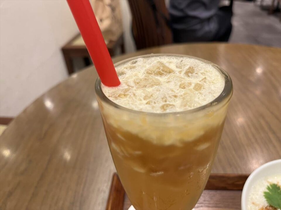 最後に愛玉ジャスミンレモンティーです。となりで本を読んでいた常連さんが飲んでいたホットミルクティーもなみなみに注がれていておいしそうだったのですが、愛玉が気になりすぎてこちらにしました。ちなみにお店の人に聞いたところ、お店の3番人気(台湾モーニングのメニューの中では1番人気)だそうです。