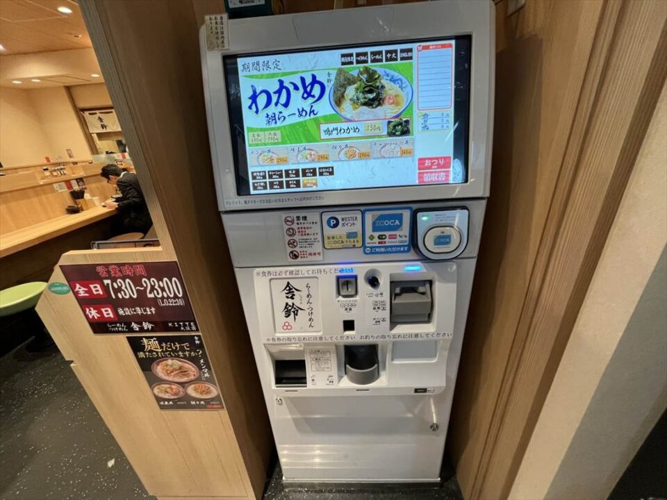 舎鈴の注文は券売機で食券を購入します。使える電子マネーがICOCAグループの交通系カードだけと限られているので要注意です。
