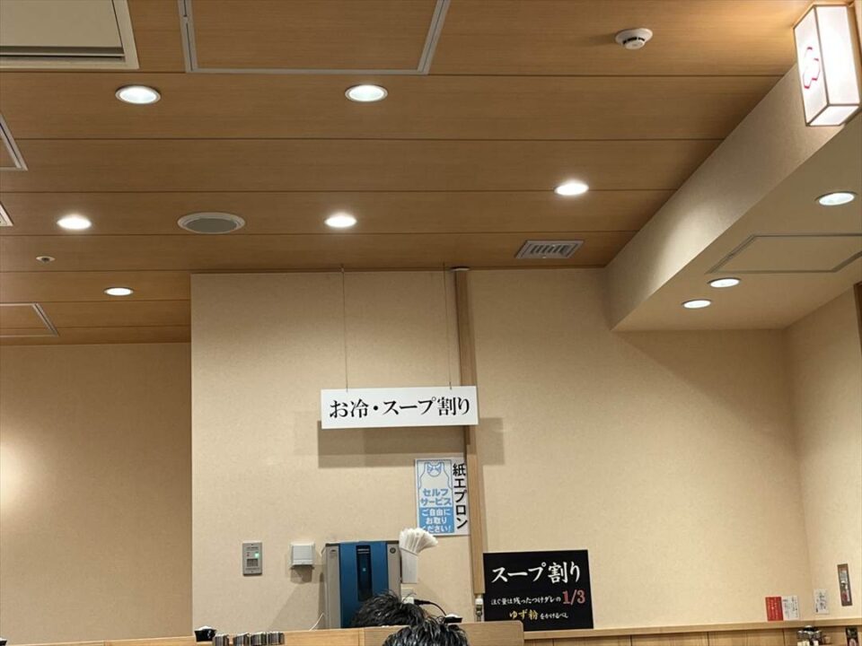 お冷はセルフで入れます。お冷のコーナーがあって、そこに紙コップが置いてあります。その横に紙エプロンが……。