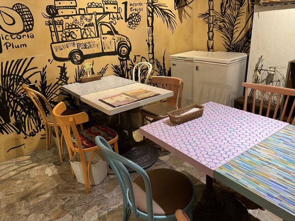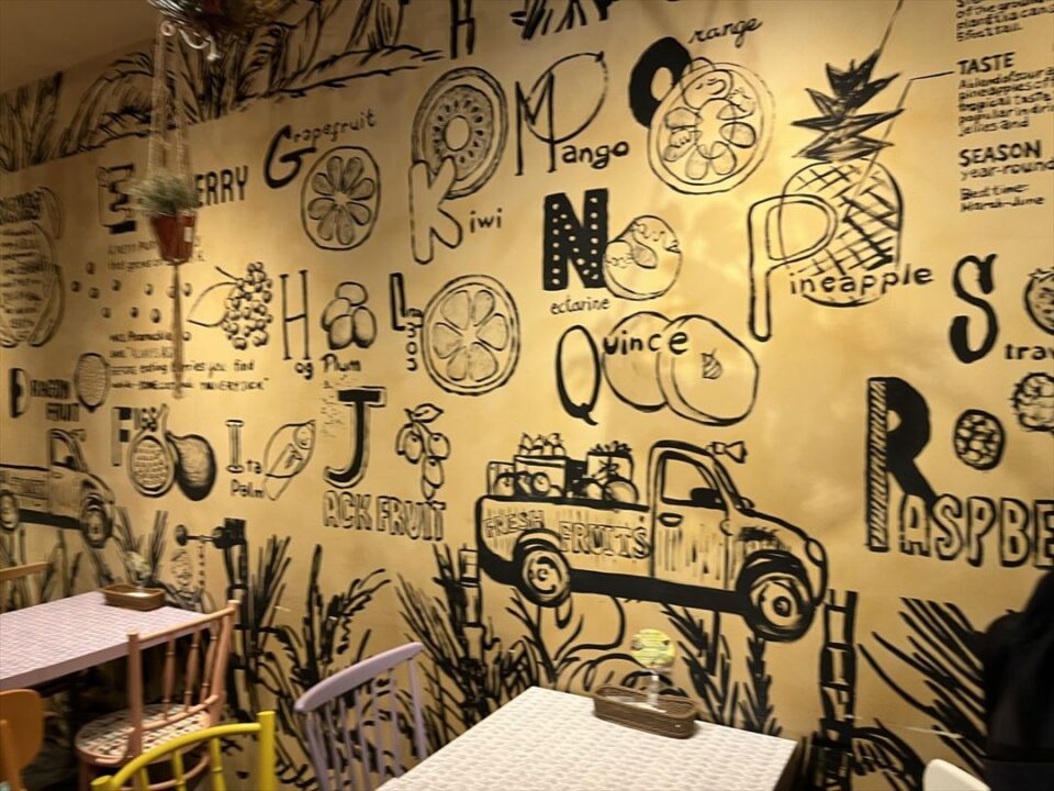 店内は全体的にかわいい雰囲気。壁一面にはポップなイラスト。こんな主張が激しそうな壁紙なのに、意外と他のインテリアともうまくマッチしているのが面白い。