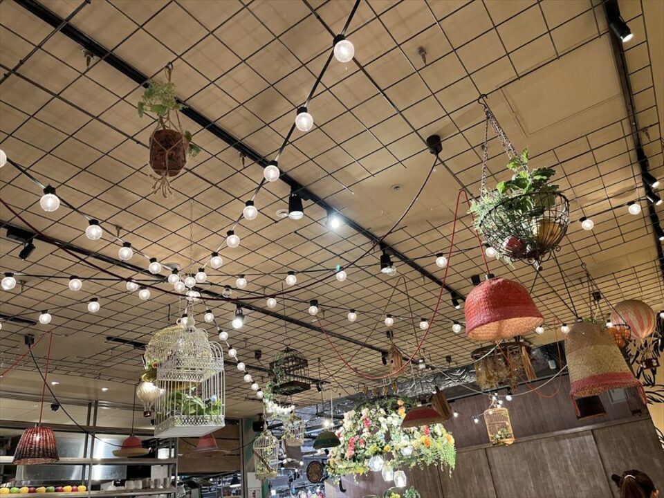 そして、天井には鳥かごや植物。こんな小さなかわいいものがあちこちに飾ってあります。若い女性好みのインテリアですよね。
