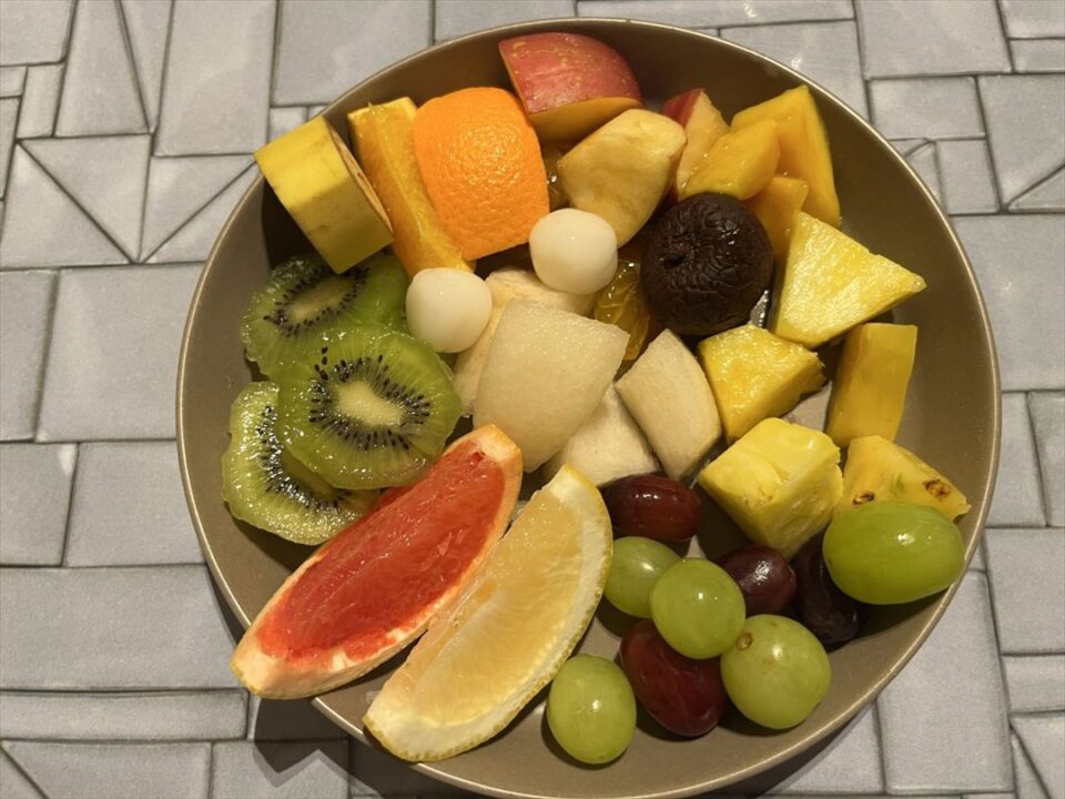 まずはフルーツ。フルーツはオレンジ、グレープフルーツ、柿、りんご、ライチ、マンゴー、パイナップル、バナナ、キウイ、梨、ぶどう。こんな感じのラインナップでした。