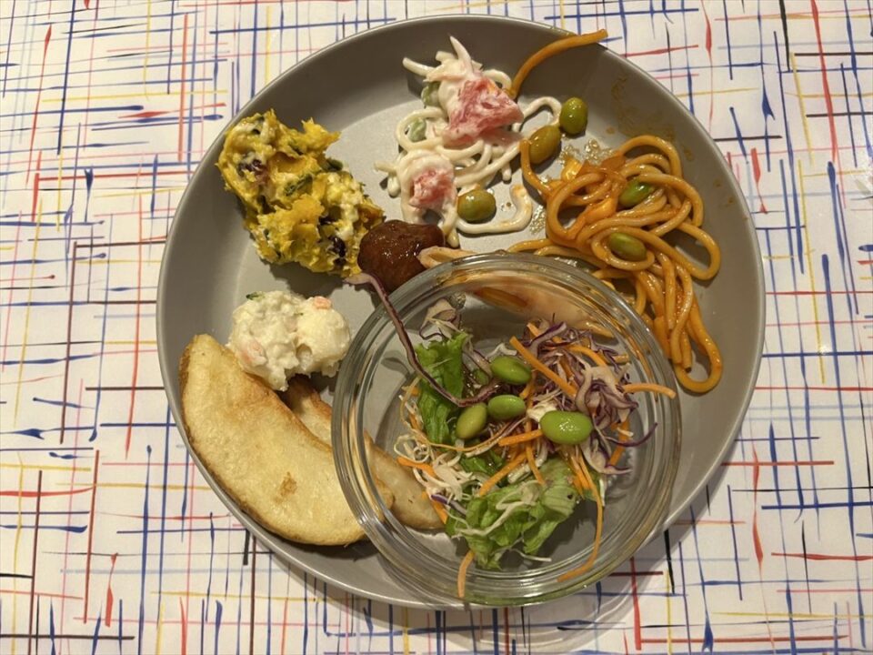 こちらにはフルーツやケーキをはじめとしたスイーツがたくさん。そして、奥の別のコーナーにはサラダやフードなどが置かれていました。