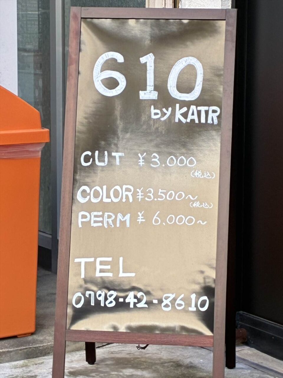 例えばカットは3,000円(税込・シャンプー付)。パーマは6,000円~。カラーは3,500円~。白髪染めは4,000円~と一律です。まさにお客様ファーストな美容室なのです。 ※写真は2号店の今津の610byKATR(ロクイチゼロバイカトル)の看板