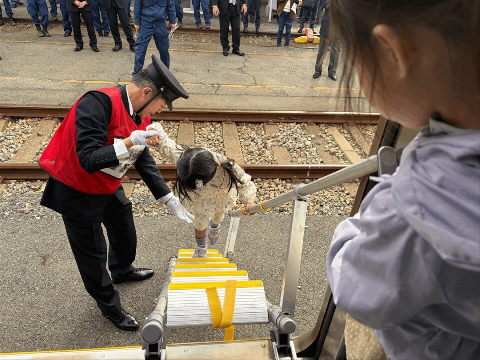 また、目の不自由な方など1人でハシゴでの降車が無理な方は社員の方がついて誘導し、車椅子の方は担架で本人と車椅子を別々に下ろし走れる場所まで移動していました。