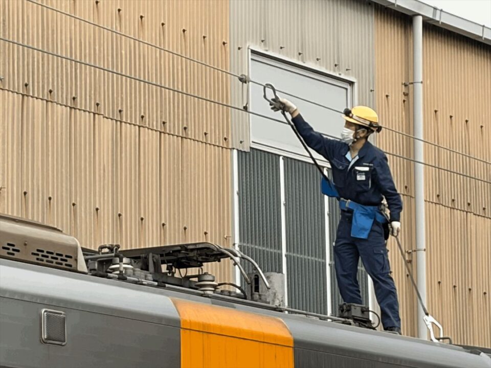 まず被害状況の確認をしたあと、破損したパンタグラフを固定します。