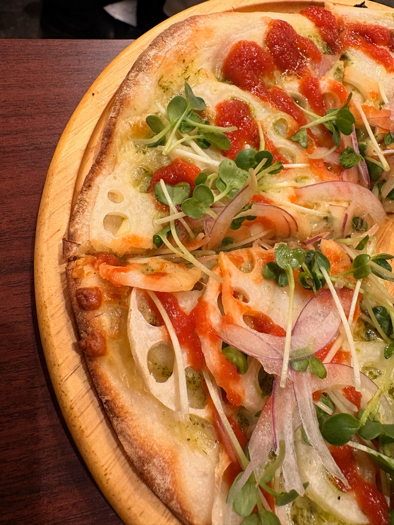 れんこんが入ったピザははじめて食べましたが、れんこんのシャキシャキとした食感がしっかりと楽しめて、チーズやジェノベーゼソースとの相性もバッチリ!この手のお店だと不足しがちな野菜がちゃんと摂取できるのもポイント高い!!
