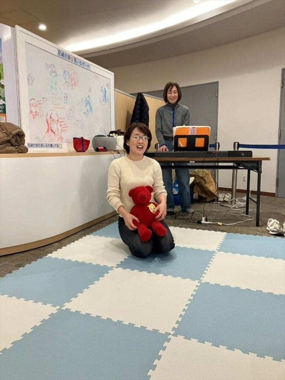 あまがさき観光案内所に入ると、奥の広いスペースに靴を脱いで上がれるパネルマットが敷かれたエリアが準備されており、手前の長机で受付を済ませます。