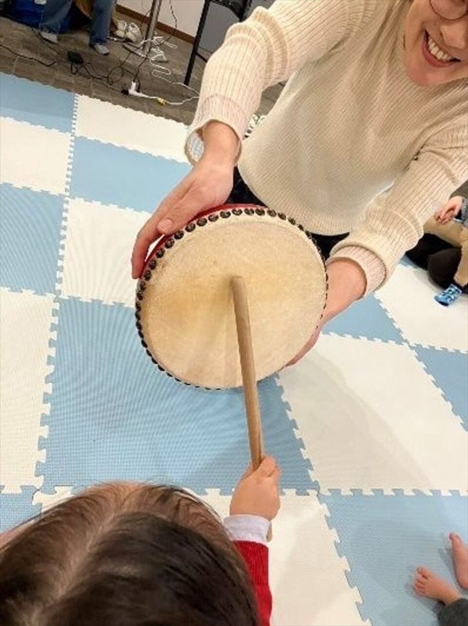 続いて出てきたのは小さな赤いかわいい太鼓。お歌に合わせて、参加者のお子さん達に順番にバチが渡っていき、思い思いに太鼓を叩いていきます。