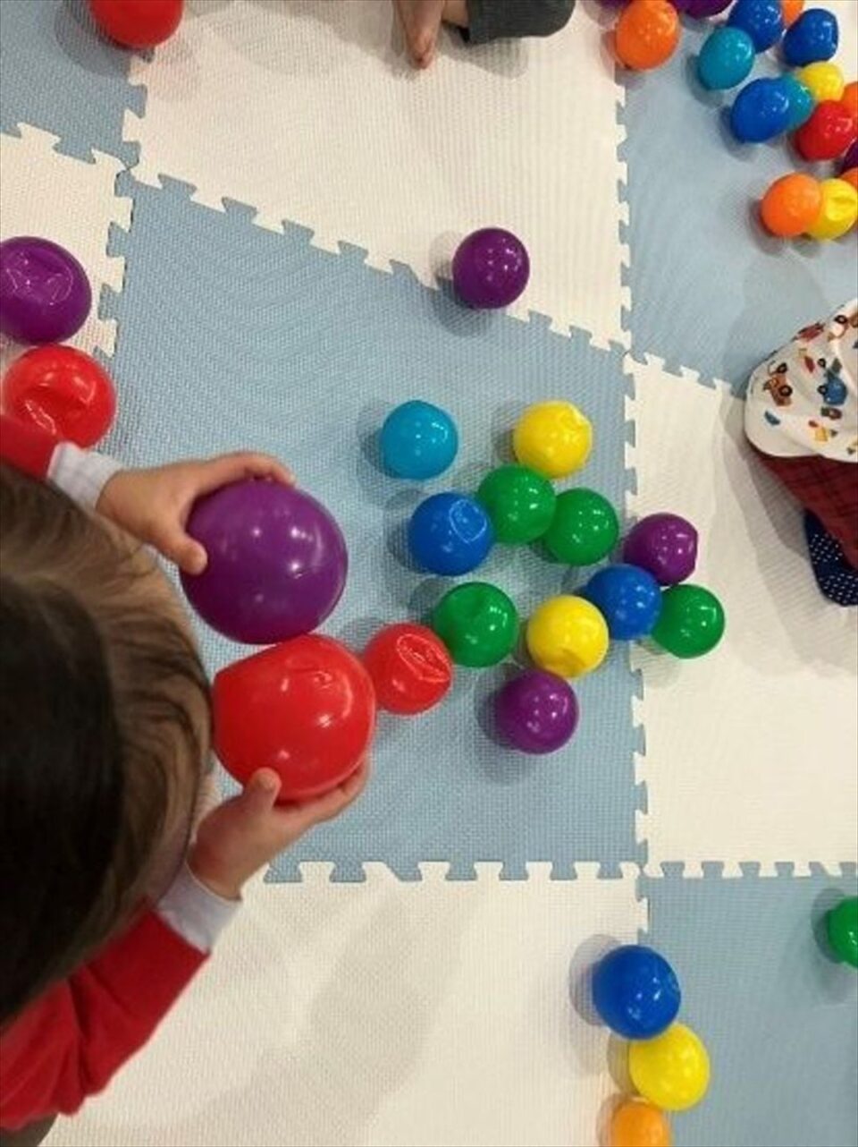好きな色のボールを手に取って、カチカチと合わせてみています。