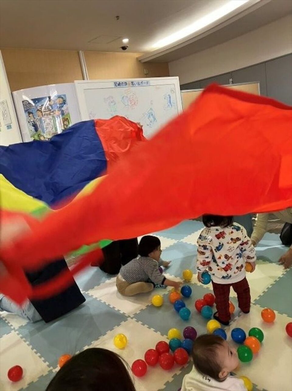 ボールを使った音楽遊びの後は、大きなパラバルーンが出てきて、ママたちが端を持ちながら音楽に合わせて揺らしたり持ち上げたりすると、バルーンの下でボールと一緒にその様子を楽しみながら子どもたちも大はしゃぎ!