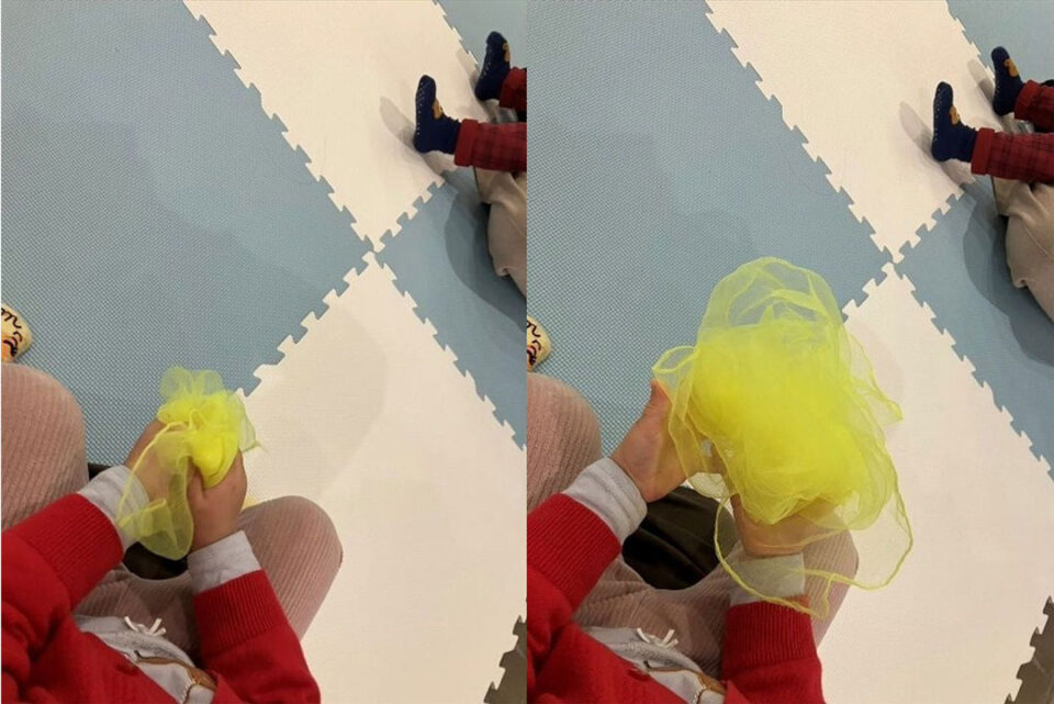 リトミックスカーフを音に合わせて顔の前にかけてばぁ!と顔を出すなど、同じ一つのアイテムでも色んな楽しみ方ができます。