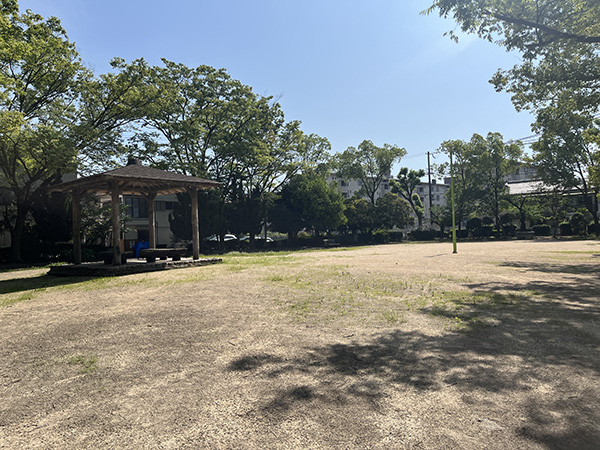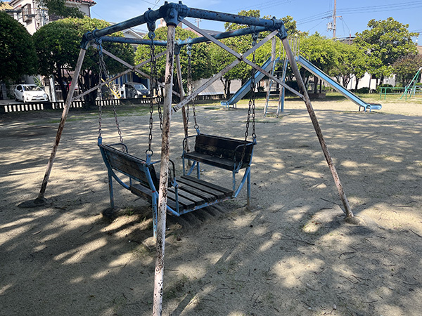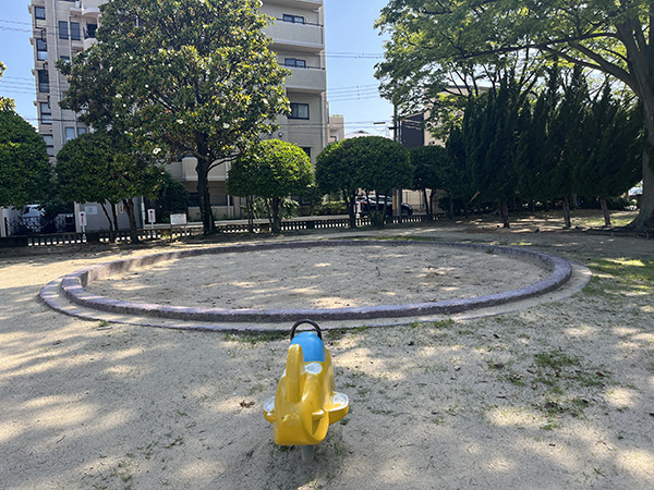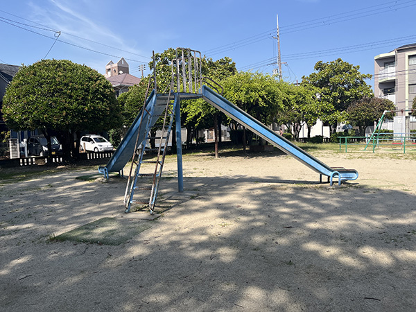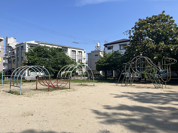 大きな高木に囲まれていて、緑豊かな公園です。ブランコなどをはじめとする遊具のそばにはベンチが設置されており、子どもさんの付き添いの方がそこに腰掛けて、遊具で遊ぶ子どもさんを見守ることができそうです。この公園の隣には、グラウンドのようなスポーツができるスペースがあります。そこでスポーツをしている子どもさんは自主練習に使ったり、友達と一緒にスポーツをして楽しめそうです。ベンチは、木陰になるような場所に設置されているので、暑さをしのぎつつ休憩ができそうです。夏季は、そこで熱中症予防になるかもしれません。