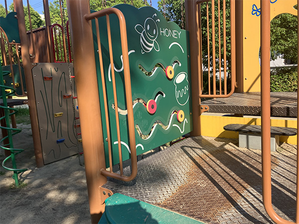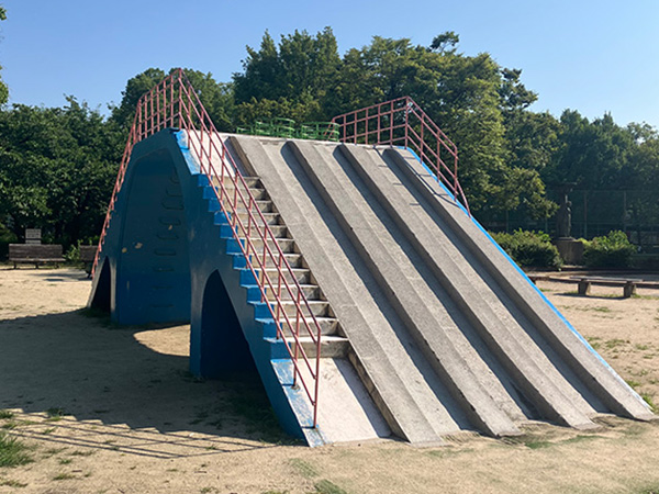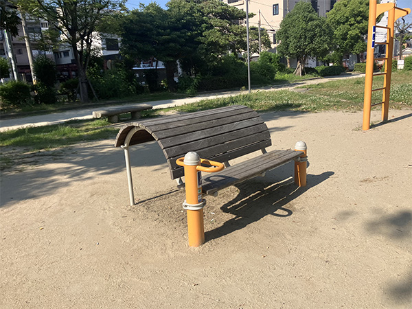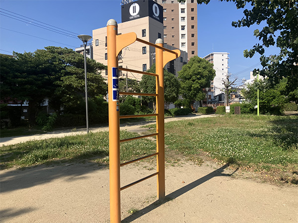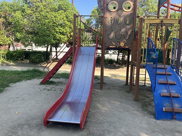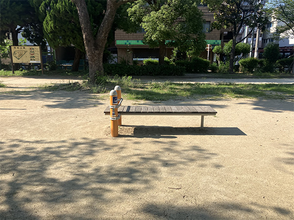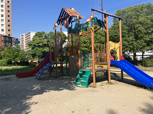 国道2号線の南側、阪神杭瀬駅から徒歩2分のところにあるアクセスのよい公園です。子どもさん向けの遊具が充実しています。その中でも目を引くのは、カラフルな複合型遊具です。取材時には、小学生の子どもさんたちがそれを使って楽しそうに遊んでいました。また、ストレッチや軽い筋力トレーニングができる大人向けの健康器具も設置されています。トイレは設置されていますが、あまり清潔な感じがしなかったので、近隣にあるコンビニエンスストアのトイレや駅高架下のショッピングモール内のトイレを借りた方がよさそうです。