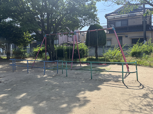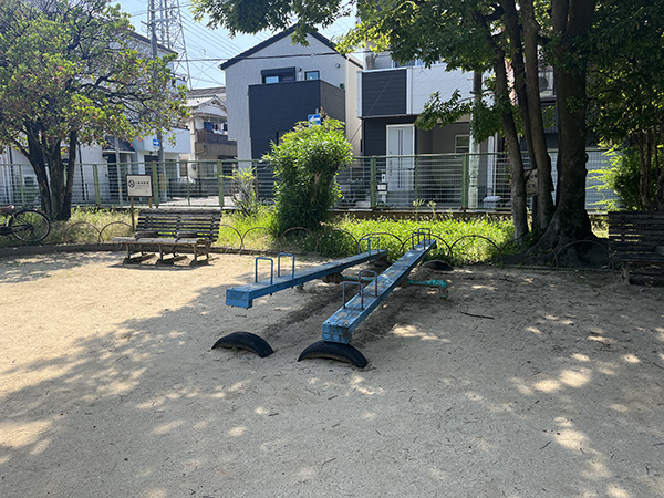 公園内は喫煙禁止という看板が設置してあり、たばこの煙による害や、火事などに対する安全面の配慮があると感じます。砂場の近くにはベンチが設置してあり、そこに腰掛けて付き添いの方は、子どもさんを安心して見守ることができそうです。遊具は、すべり台が台座が2方向に分かれた複合型になっていたり、シーソーが2基設置されていたりと、子どもさんたちが遊ぶ際に混み合わないように、という配慮を感じます。公園の隣には、少し広めのグラウンドがあり、スポーツをするのに最適です。高いフェンスが設置されているので、サッカーや野球などのボールを使った遊びができます。手洗い場は、きれいで使いやすそうです。